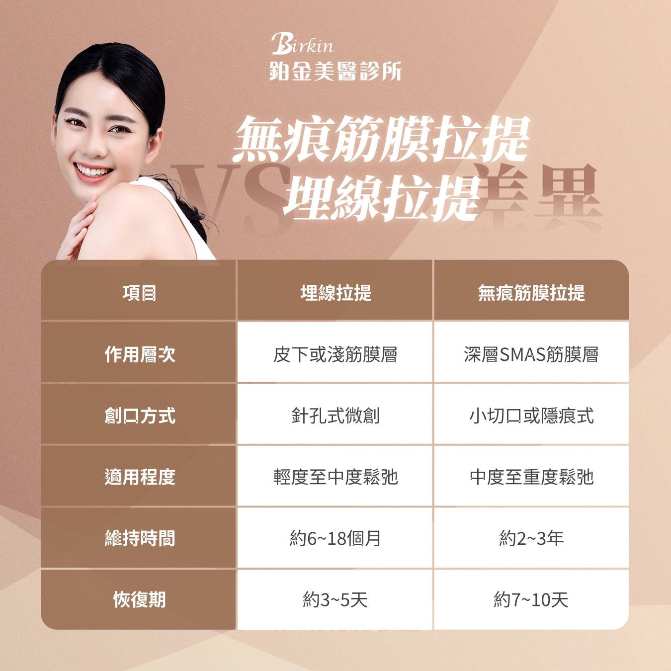 為了方便大家快速掌握兩者差異,鉑金美醫診所整理了埋線拉提與無痕筋膜拉提的比較表如下: