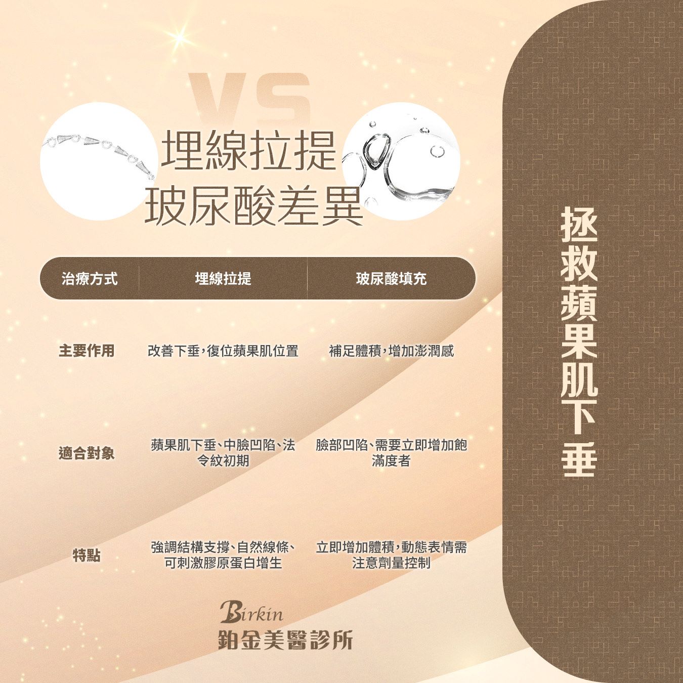 很多人會好奇,想恢復蘋果肌的澎潤感,是否可以只利用玻尿酸來完成?其實,兩者原理和效果各有不同,鉑金美醫診所整理下表方便大家快速掌握差異: